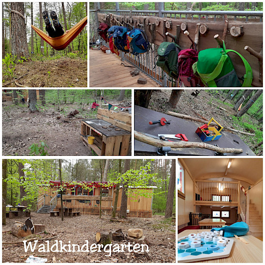 Die Waldgruppe ist mit einem großen Bauwagen mit angrenzender Terasse ausgestattet. Im Bauwagen befinden sich ein Gardarobenbereich, ,eine kleine Küchenzeile, Toilette mit Wickelmöglichkeit und Spielecken. Auf dem Grundstück befinden sich weitere Spielbereiche und eine Komposttoilette.